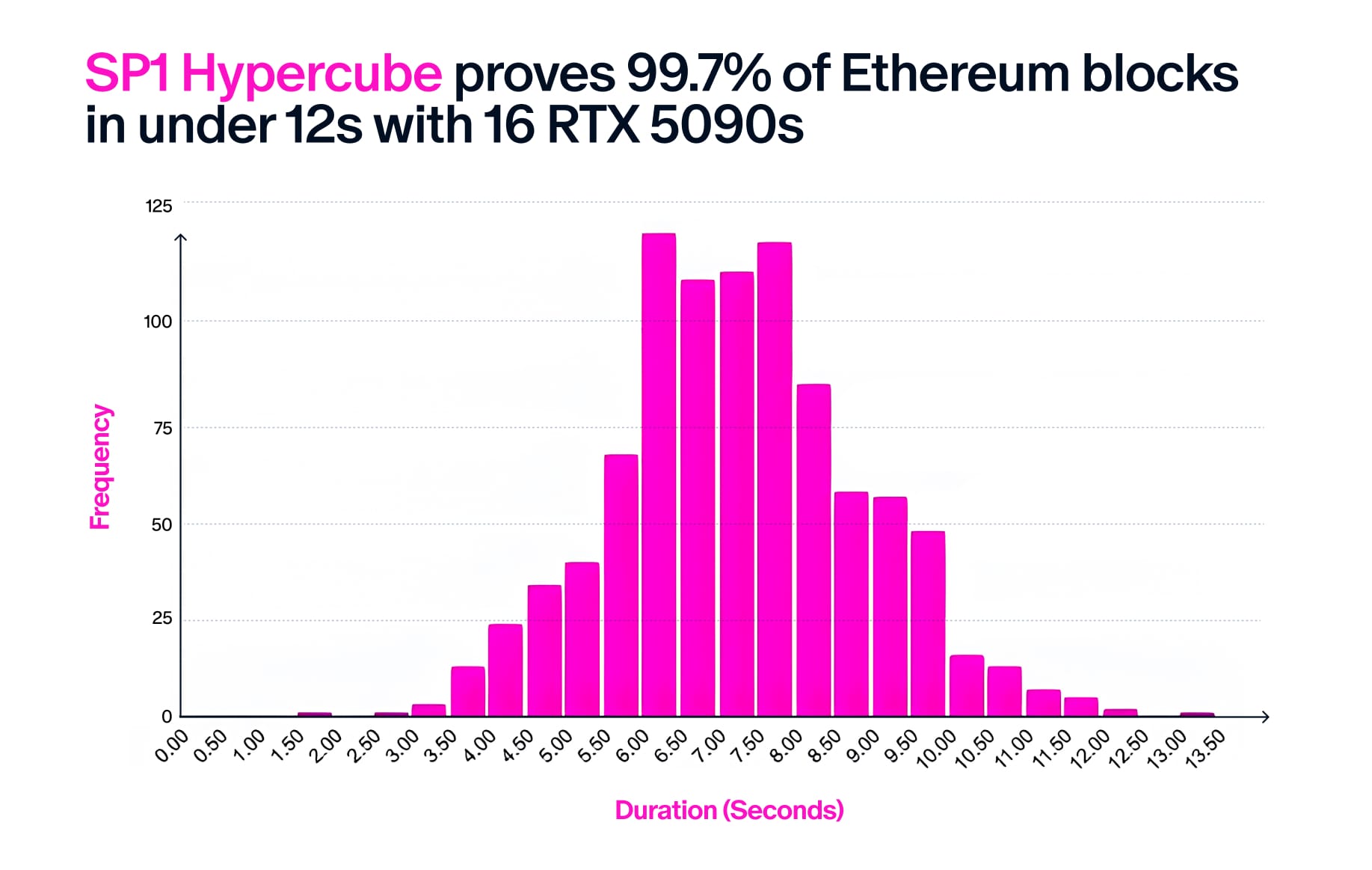 Succinct is the first team to achieve real-time proving with 16 GPUs, a breakthrough towards the Ethereum Foundation’s goal of introducing zkEVM to the L1. The latest version of the SP1 Hypercube zkVM proves 99.7% of L1 Ethereum blocks on 16 NVIDIA RTX 5090 GPUs under 12s, and 95.4% of blocks under 10s.