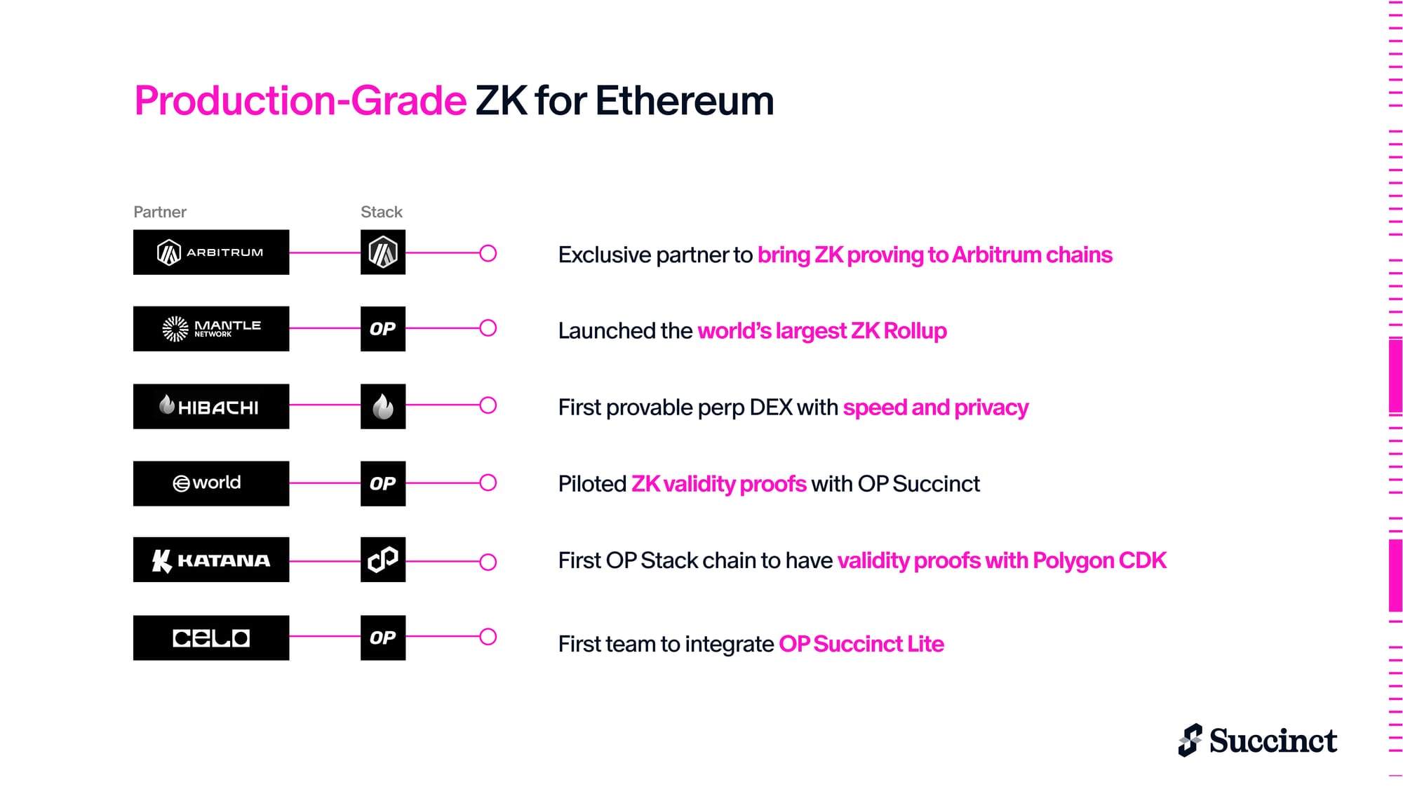 OP Succinct and OP Succinct Lite, our flagship products for OP Stack rollups, enable full ZK validity proofs that turn optimistic rollups into Type-1 zkEVMs. Multiple teams are using OP Succinct in production today, with our Arbitrum integration launching soon. More than 35 partners are building with SP1, benefiting from the ability to write programs in standard Rust and speeding up development 100x faster than custom circuits.