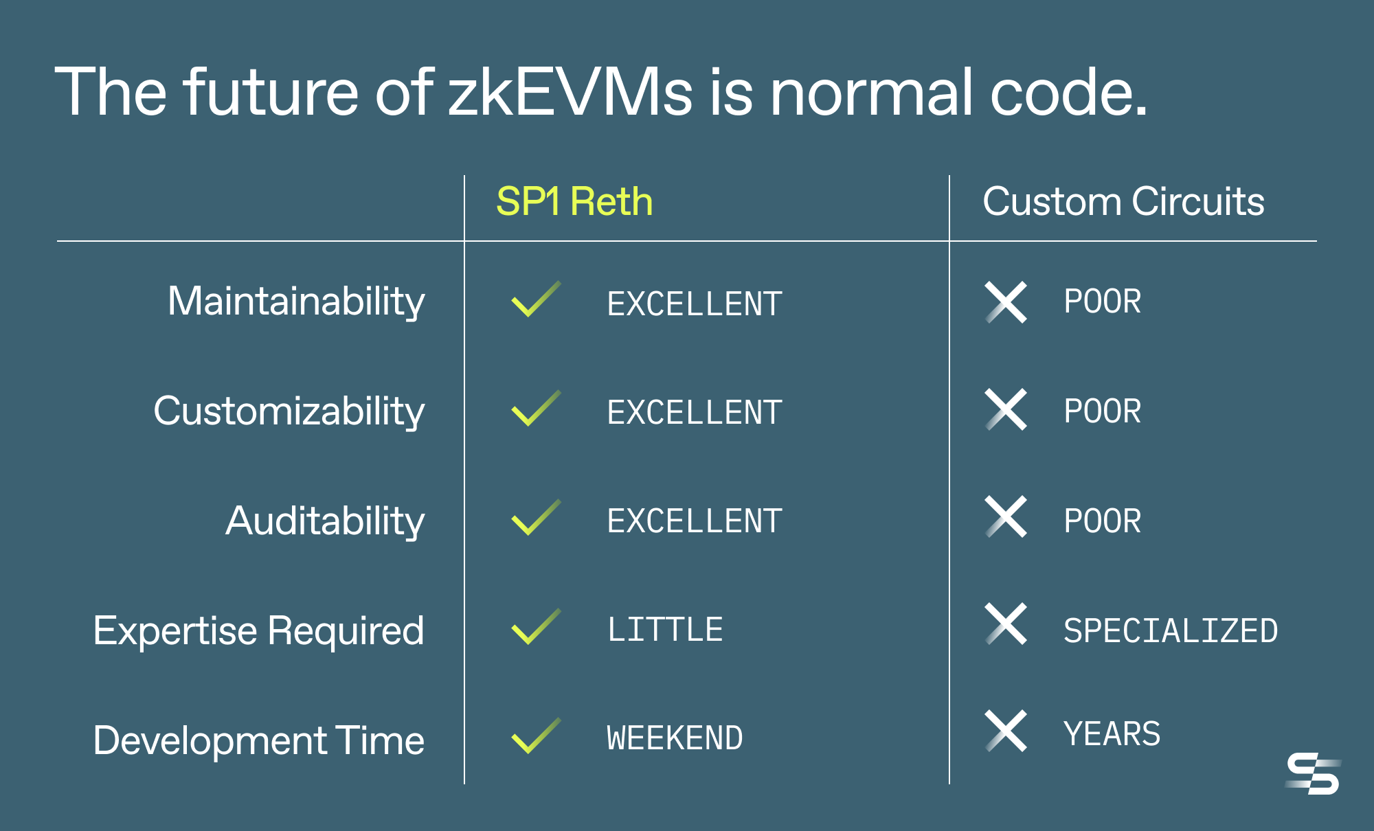 Because of code reuse, SP1 Reth is far more maintainable and secure, with a smaller audit surface compared to custom circuits. The usage of normal code allows for any developer to easily customize the zkEVM when adding new precompiles or making other changes. Finally, the development time for SP1 Reth is 100x faster than with custom circuits and requires no specialized expertise.