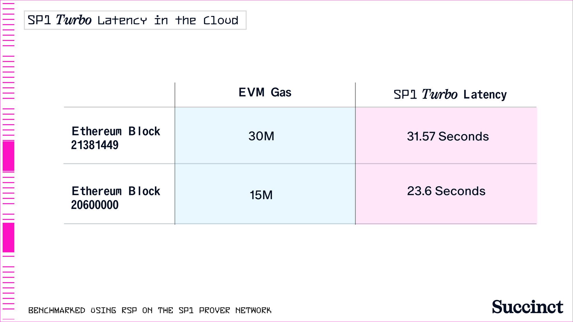 - SP1 Turbo has unrivaled latency when running across a cluster of parallelized GPUs, inching closer to real-time Ethereum proving.