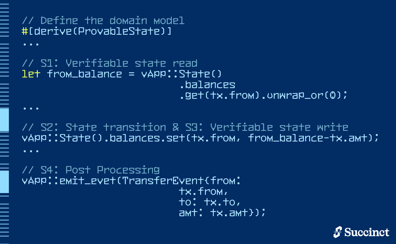 The SDK comes with a Rust-based domain specific language that easily allows developers to wrap their application logic in the required components. In Figure 4, we show how the vApp SDK can implement a simple token transfer. The SDK makes use of annotations like #[derive(ProvableState)] to ensure that balance updates are captured in a commitment-friendly data structure and the #[vApp:Handler] entry point encodes the application logic that passes through the prover. Importantly, the developer only writes Rust. The rest just works.