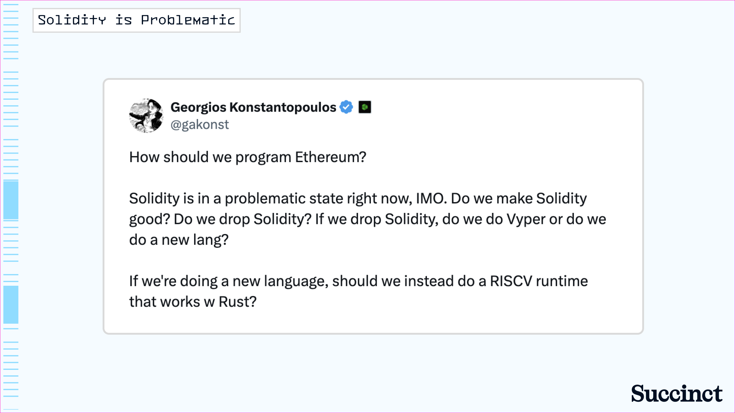 Programming applications in the current paradigm requires developers to incur overhead due to specialized languages such as Solidity. Compare the nearly 3 million Rust developers worldwide to Solidity developers, which are a small fraction of this. As noted by industry leaders (Figure 2), Solidity development is challenging and causes developers to have to inherit the technical debt of the language improvement roadmap.