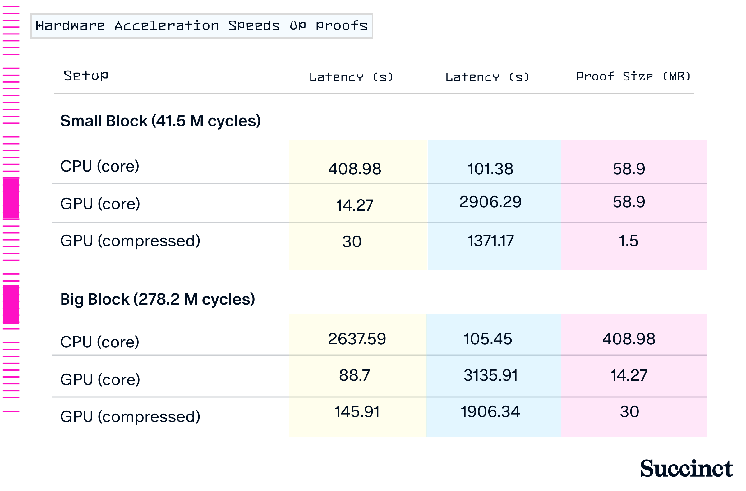 zkVMs are highly optimizable with accelerated hardware. GPUs increase throughput by up to 30x, as shown in Figure 7. Parallelization in clusters of GPUs can multiply this by orders of magnitude. Already, Succinct runs thousands of GPUs for our production customers. As vApps get built out, the Succinct network will become a key piece of infrastructure for app developers to use proof generation services out-of-the-box, with high reliability.