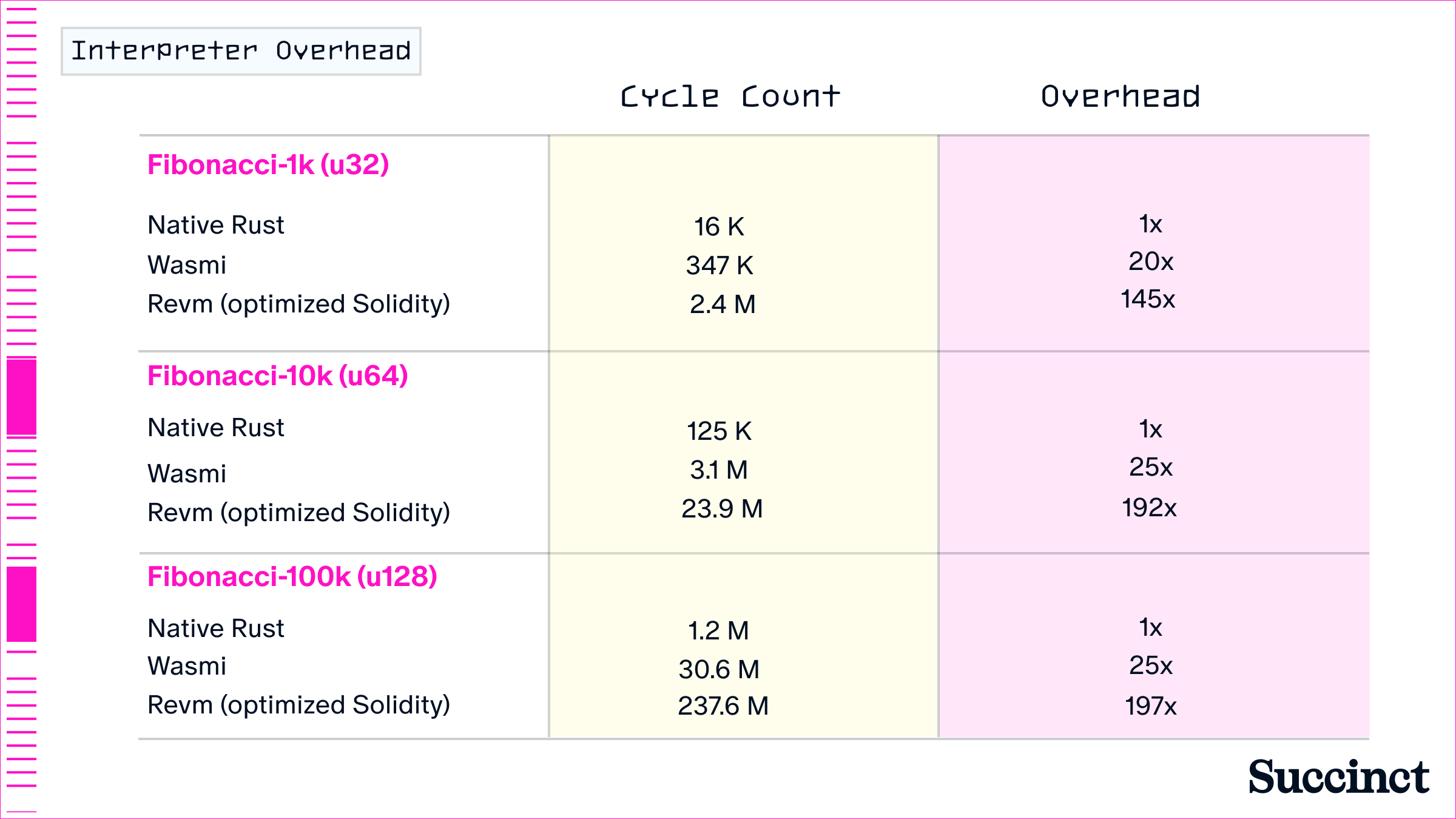 A primary cost that is imposed on developers when working with rollup stacks on layers like Ethereum is the constraints of using generalized virtual machines such as the EVM. There is a high price of verifiability for the EVM. Writing your application logic in the EVM and then making it verifiable through the interpreter that is proven through SP1 introduces a huge amount of overhead (up to 832x), as shown in Figure 1.